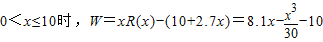 (2)①当0<x<10时,由W'=8.1-