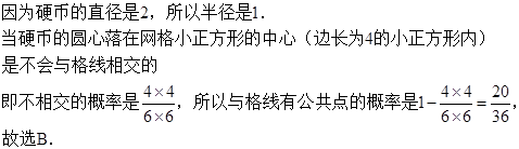 设有一个正方形网格,其中每个最小正方形的边长都等于6.现用直径等于2的硬币投掷到此网格上,则硬币落下后与格线有公共点的概率为 ( )