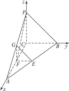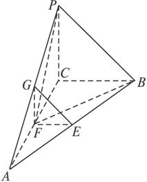 在三棱锥P—ABC中,PC⊥平面ABC,∠ACB=90°,BC=PC=1,AC=2,E、F、G分别是AB、AC、AP的中点.![]()