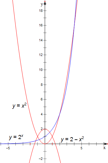 作函数y=2x、y=2-x2与y=x2的图象如下,![]()