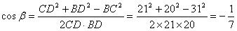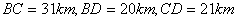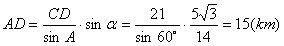 如图,某观测站C在城A的南偏西20°的方向上,由A城出发有一公路,走向是南偏东40°,在C处测得距C为31公里的公路上B处,有一人正沿公路向A城走去,走了20公里后,到达D处,此时C、D间距离为21公里,问此人还需要走多少公里到达A城。