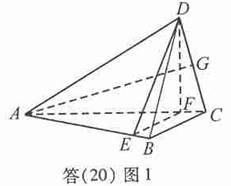 (II)如答(20)图1,过F作FE⊥AB,垂足为E,连接DE。由(I)知DF⊥平面ABC。由三垂线定理知DE⊥AB,故∠DEF为二面角C—AB—D的平面角。