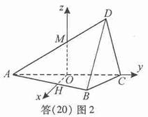 解法二:(I)如答(20)图2,设O是AC的中点,过O作OH⊥AC,交AB于H,过O作OM⊥AC,交AD于M,由平面ABC⊥平面ACD,知OH⊥OM。因此以O为原点,以射线OH,OC,OM分别为x轴,y轴,z轴的正半轴,可建立空间坐标系O—xyz.已知AC=2,故点A,C的坐标分别为A(0,—1,0),C(0,1,0)。