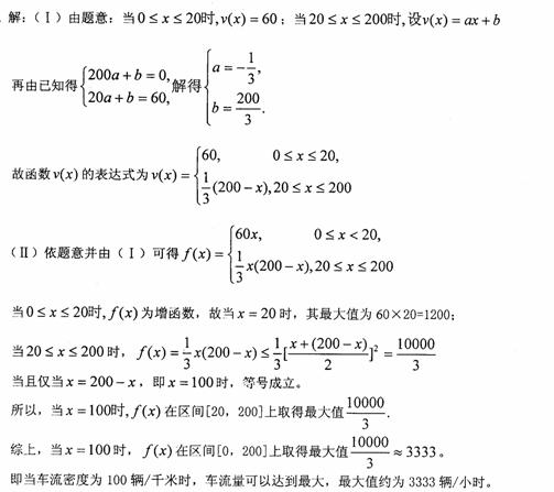 提高过江大桥的车辆通行能力可改善整个城市的交通状况。在一般情况下,大桥上的车流速度v(单位:千米/小时)是车流密度x(单位:辆/千米)的函数。当桥上的的车流密度达到200辆/千米时,造成堵塞,此时车流速度为0;当车流密度不超过20辆/千米时,车流速度为60千米/小时,研究表明;当