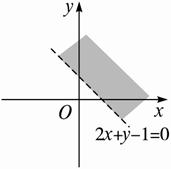 解:(1)先作出边界2x+y-1=0,因为这条线上的点都不满足2x+y-1>0,所以画成虚线,取原点(0,0)代入2x+y-1得-1,-1>0不成立,原点在不等式2x+y-1>0所表示的平面区域外,∴2x+y-1>0表示原点的另一侧即直线的右上方区域,如图.