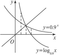 y=log0.9x与y=0.9x互为反函数,关于y=x对称,由示意图知log0.90.3>0.90.9,