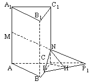 | (Ⅲ)如图2,连结PP1, 则PP1就是平面NMP与平面ABC的交线,作 又CC1⊥平面ABC,连结CH, 由三垂线定理得, ∴∠NHC就是平面NMP与平面ABC所成二面角的平面角(锐角), 在 ∴ 在 故平面NMP与平面ABC所成二面角(锐角)的大小为 |