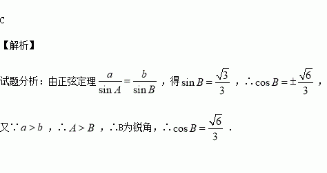 已知△ABC内角A、B、C所对的边分别为a、b、c,若a=3,b=2,A=60°,则cosB=( )