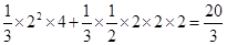 试题分析:观察三视图可知,原几何体是由一个四棱锥和一个三棱锥组成.其中四棱锥底面是边长为2 的正方形,高为4;三棱锥底面一条边长为2,这条边上的高为2的三角形,三棱锥的高为2,所以几何体体积为