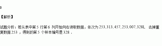 某工厂利用随机数表对生产的700个零件进行抽样测试,先将700个零件进行编号001、002、…、699、700.从中抽取70个样本,下图提供随机数表的第4行到第6行,若从表中第5行第6列开始向右读取数据,则得到的第5个样本编号是( )