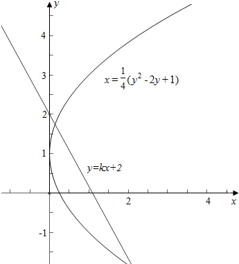 作函数y=kx+2与y2-4x-2y+1=0的图象如下,![]()