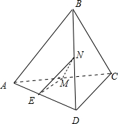 1.设向量$\overrightarrow{AB},\overrightarrow{CD}$分别在两条异面直线上,M,N分别为线段AC,BD的中点.求证:向量$\overrightarrow{AB},\overrightarrow{CD},\overrightarrow{MN}$共面.分析 如图所示,取AD的中点E,连接EM,EN.由三角形中位线定理可得:EN∥AB,EM∥CD,利用$\overrightarrow{EN}$,$\overrightarrow{EM}$,$\overrightarrow{MN}$共面,即可证明.