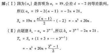 已知是首项为19,公差为-2的等差数列,为的前项和.(Ⅰ)求通项及;(Ⅱ)设是首项为1,公比为3的等比数列,求数列的通项公式及其前项和.