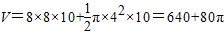 【答案】分析:(I)由几何体的三视图可知该几何体为底部为长方体,(该长方体的棱长分别为8,8,10),上部为半个圆柱(圆柱的底面直径为8,高为10)代入体积公式可求
