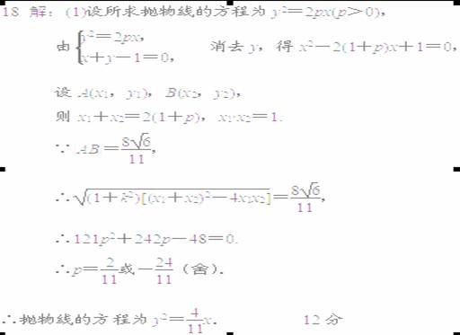 (本小题满分12分)抛物线的顶点在原点,焦点在x轴正半轴上,直线x+y-1=0与抛物线相交于A、B两点,且|AB|=,求抛物线的方程。