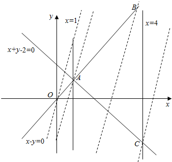 作出不等式组$\left\{\begin{array}{l}{(x+y-2)(x-y)≥0}\\{1≤x≤4}\end{array}\right.$所表示的平面区域即可行域如图所示的△ABC.