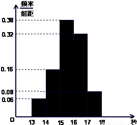 【答案】分析:(1)根据频率分步直方图做出这组数据的成绩在[14,16)内的人数为50×0.16+50×0.38,这是频率,频数和样本容量之间的关系.