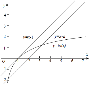 当直线y=x+a,与曲线y=lnx相切时,设切点为(x0,x0+a),