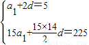 【答案】分析:(1)由a3=5,S15=225列式求出数列{an}的首项和公差,写出通项公式,然后根据