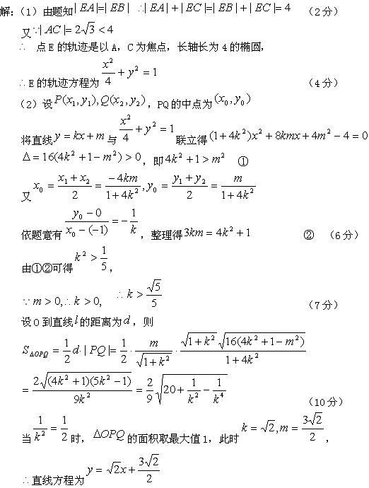 与E的轨迹交于P,Q两点,且以PQ为对角线的菱形的一顶点为(-1,0),求: