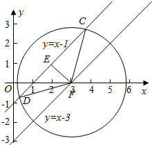 4.已知集合M={(x,y)|x-3≤y≤x-1},N={P|PA≥$\sqrt{2}$PB},A(-1,0)、B(1,0),则表示M∩N的图形的面积等于$\frac{4}{3}$π+2$\sqrt{3}$.分析 建立坐标系:M为直线y=x-1和y=x-3之间的点的集合(含线上的点),N集合为以(3,0)为中心,半径为2$\sqrt{2}$的圆内的点的集合,联立方程组,求出点C,D的坐标,求出CD的长,再解直角三角形,求出扇形的圆心角,根据图形之间的面积,最后求出M∩N的图形面积.