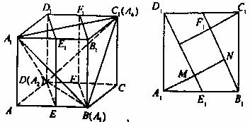 解法二:如图,现将此正四面体A1A2A3A4置于一个正方体ABCD—A1B1C1D1中,(或者说,在正四面体的四个面外侧各镶嵌一个直角三棱锥,得到一个正方体),E1,F1分别是A1B1,C1D1的中点,EE1D1D和BB1F1F是两个平行平面,若其距离为1,则四面体A1A2A3A4即为满足条件的正四面体。右图是正方体的上底面,现设正方体的棱长为a,若A1M=MN=1,则有