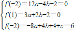 【答案】分析:(1)因为函数f(x)=ax3+bx2-2x+c在x=-2时有极大值6,在x=1时有极小值得到三个方程求出a、b、c;