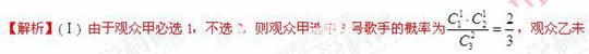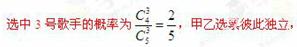 在一场娱乐晚会上, 有5位民间歌手(1至5号)登台演唱, 由现场数百名观众投票选出最受欢迎歌手. 各位观众须彼此独立地在选票上选3名选手, 其中观众甲是1号歌手的歌迷, 他必选1号, 不选2号, 另在3至5号中随机选2名. 观众乙和丙对5位歌手的演唱没有偏爱, 因此在1至5号中随机选3名歌手.
