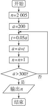 某厂2005年的年生产总值为200万元,技术革新后预计以后每年的年生产总值都比上一年增长5%,设计一个程序框图,输出预计年生产总值超过300万元的最早年份.