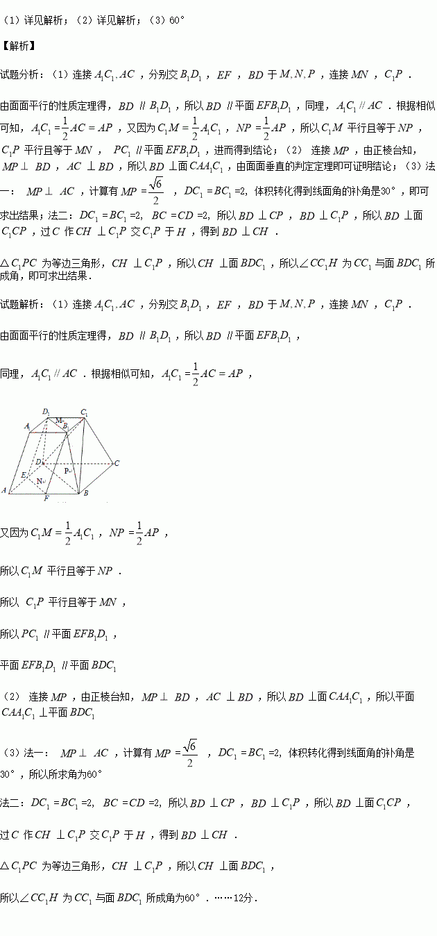 (本小题满分12分)如图,在正四棱台中,=1,=2,=,分别是的中点.