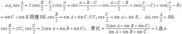 内接于单位圆,三个内角A、B、C的平分线延长后分别交此圆于、、。则的值为( )