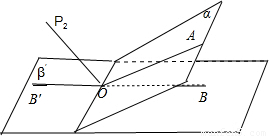 (2)如图2,设OP2为∠AOB的补角∠AOB′,则∠P2OA=∠P2OB=65°,与平面α,β所成的角都是65°.当OP2以O为轴心,在二面角α-l-β′的平分面上转动时,OP2与两平面夹角变小,对称地在图中OP2两侧会出现25°情形,有两条.此时过P且与OP2平行的直线符合要求,有两条.