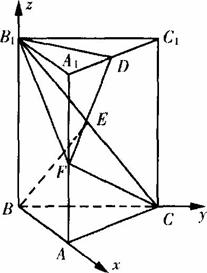 如图,直三棱柱ABC-A1BlCl中,底面是以∠ABC为直角的等腰直角三角形,AC=2a,BB1=3a,D为A1C1的中点,E为B1C的中点.![]()
