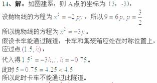 某隧道的横段面是由一段抛物线及矩形的三边组成的,尺寸如图所示。某卡车空车时能通过此隧道。现载一集装箱,箱宽3米,车与箱共高米。此时,卡车能否通过此隧道?说明理由。