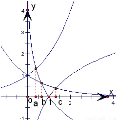 【答案】分析:比较大小 可以借助图象进行比较,观察题设中的三个数a,b,c,可以借助函数图象的交点的位置进行比较.