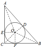 7.已知直角三角形的三边长分别为a,b,c(其中c为斜边长),其内切圆半径为t,求证:r=$\frac{a+b-c}{2}$.分析 作OD⊥AB于D,OE⊥AC于E,OF⊥BC于F,如图,根据切线的性质得OD=OE=OF=r,再证明四边形CEOF为正方形,所以CE=CF=r,然后根据切线长定理得AE=AD=b-r,BF=BD=a-r,则b-r+a-r=c,所以r=$\frac{a+b-c}{2}$.