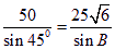 在△ABC中,若a=50,b=25, A=45°则B= .