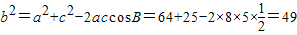 ∵内角A,B,C成等差数列,边长a=8,c=5,