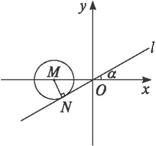 提示:解法一:因为直线经过原点和第三象限, 所以斜率k>0,排除B、D. 圆心到直线y= 解法二:如图所示,圆心M(-2,0),直线l切圆M于点N,N在第三象限,则|MN|=1,且l过原点.记l的倾斜角为α, 在Rt△MNO中,sinα= ∴α= 答案:C