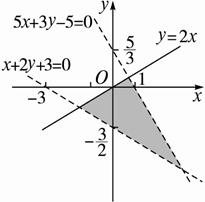 解:不等式y-2x≤0表示直线y-2x=0及右下方的平面区域(画成实线),不等式x+2y+3>0表示直线x+2y+3=0的右上方的平面区域,不等式5x+3y-5<0表示直线5x+3y-5=0左下方的平面区域,所以不等式组