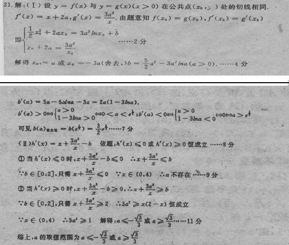 (本小题满分12分) 已知函数(Ⅰ)设两曲线有公共点,且在公共点处的切线相同,若,试建立关于的函数关系式,并求的最大值;(Ⅱ)若在(0,4)上为单调函数,求的取值范围。