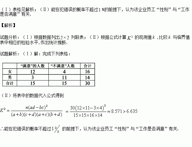 £¨¢ò£©¸ù¾ÝÉÏÊö±íÖÐÊý¾Ý£¬ÀûÓöÀÁ¢ÐÔ¼ìÑéµÄ·½·¨Åжϣ¬ÄÜ·ñÔÚ·¸´íÎóµÄ¸ÅÂʲ»³¬¹ý1%µÄǰÌáÏ£¬ÈÏΪ¸ÃÆóÒµÔ±¹¤¡°ÐÔ±ð¡±Óë¡°¹¤×÷ÊÇ·ñÂúÒ⡱Óйأ¿