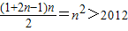【答案】分析:框图首先给循环变量n赋值1,给累加变量p赋值1,然后执行运算n=n+1,p=p+2n-1,然后判断p>2012是否成立,不成立循环执行n=n+1,p=p+2n-1,成立时算法结束,输出n的值.且由框图可知,程序执行的是求等差数列的前n项和问题.当前n项和大于2012时,输出n的值.