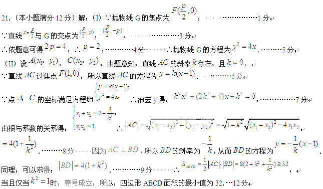 (Ⅱ)设A、B为抛物线G上异于原点的两点,且满足FA⊥FB,延长AF、BF分别交抛物线G于点C、D,求四边形ABCD面积的最小值.