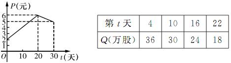 某上市股票在30天内每股的交易价格(元)与时间(天)组成有序数对,点落在下图中的两条线段上,该股票在30天内(包括30天)的日交易量(万股)与时间(天)的部分数据如下表所示。