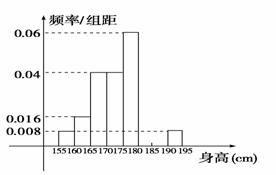 从某学校高三年级共800名男生中随机抽取50人测量身高.据测量,被测学生身高全部介于155 cm到195 cm之间,将测量结果按如下方式分成八组:第一组[155,160);第二组[160,165);…;第八组[190,195].如图是按上述分组方法得到的频率分布直方图的一部分.已知第一组与第八组人数相同,第六组、第七组、第八组人数依次构成等差数列.