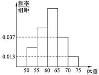 为了了解我校今年准备报考飞行员的学生的体重情况,将所得的数据整理后,画出了频率分布直方图(如图),已知图中从左到右的前3个小组的频率之比为1∶2∶3,第2小组的频数为12,则报考飞行员的学生人数是 .