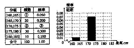 为了解我区中学生的体质状况及城乡大学生的体质差异,对银川地区部分大学的学生进行了身高、体重和肺活量的抽样调查。现随机抽取100名学生,测得其身高情况如下表所示。
