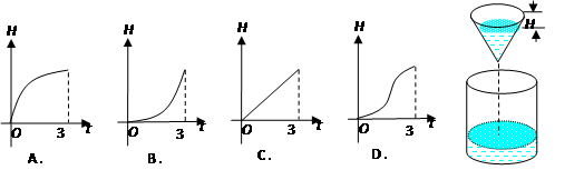 如图所示,液体从一圆锥形漏斗漏入一圆柱形桶中,开始时,漏斗盛满液体,经过3分钟漏完,已知圆柱中液面上升的速度是一个常量,H是圆锥形漏斗中液面下落的距离,则H与下落时间