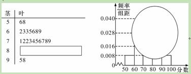 某校高三某班的一次数学测试成绩(满分为100分)的茎叶图和频率分布直方图都受到不同程度的破坏,但可见部分如下,据此解答如下问题:(1)求分数在[50,60)的频率及全班人数;(2)求分数在[80,90)之间的频数,并计算频率分布直方图中[80,90)间的矩形的高;(3)若要从分数在[80,100]之间的试卷中任取两份分析学生失分情况,在抽取的试卷中,求分数在[90,100]之间的份数的数学期望.